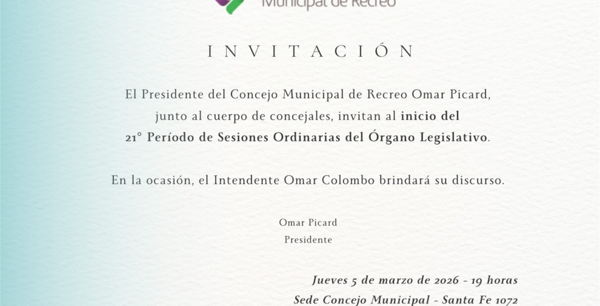 El Presidente del Concejo Municipal de Recreo Omar Picard, junto al cuerpo de concejales, invitan al inicio del 21° Periodo de Sesiones Ordinarias que se llevará a cabo el jueves 5 de marzo, a las 19 horas, en la sede