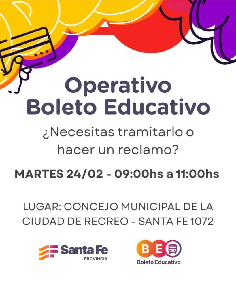 El Concejo Municipal de Recreo informa que el martes 24 de febrero, de 9 a 11 horas, estará el Operativo de Boleto Educativo en el órgano legislativo, ubicado en Santa Fe 1072.